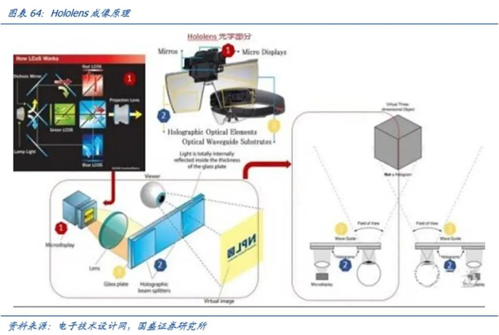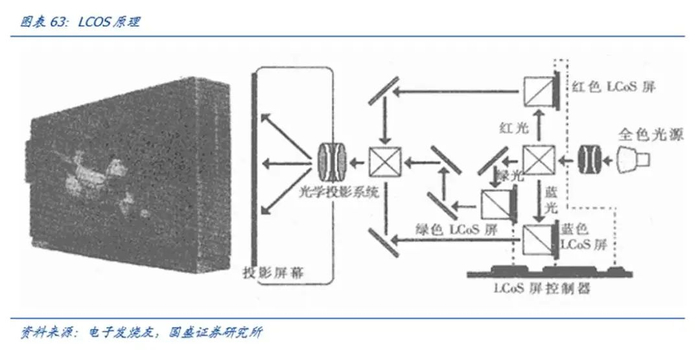 LCOS(液晶覆硅技术)是小型化AR头显的关键技术之一。三片式的LCOS成像系统,首先将投影光源发出的白色光线,通过分光系统系统分成红绿蓝三原色的光线,然后,每一个原色光线照射到一块反射式的LCOS芯片上,系统通过控制LCOS面板上液晶分子的状态来改变该块芯片每个像素点反射光线的强弱,最后经过LCOS反射的光线通过必要的光学折射汇聚成一束光线,经过投影机镜头照射到屏幕上,形成彩色的图像。