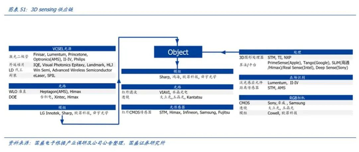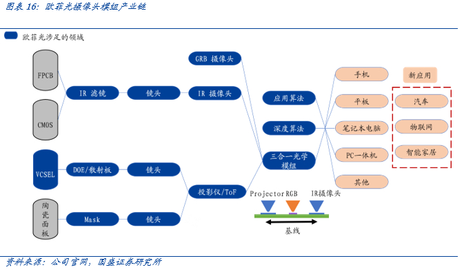 通过对已经上市的主流3D摄像头产品进行拆解分析,3D摄像头产业链可以被分为: