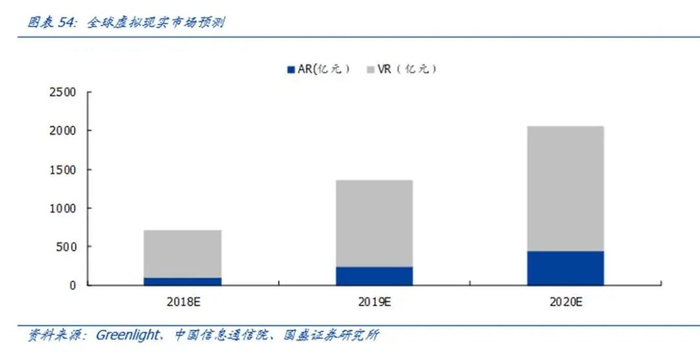 根据中国信息通信院的最新数据显示,全球虚拟现实产业规模接近千亿元人民币,2017-2022年均复合增长率有望超过70%。在整体规模方面,根据Greenlight预测,2018年全球AR\VR市场规模超过700亿元人民币,同比增长126%。其中,VR整体市场超过600亿元,VR内容市场约200亿元,AR整体市场超过100亿元,AR内容市场接近80亿元,预计2020年全球虚拟现实产业规模将超过2000亿元,其中VR市场1600亿元,AR市场450亿元。