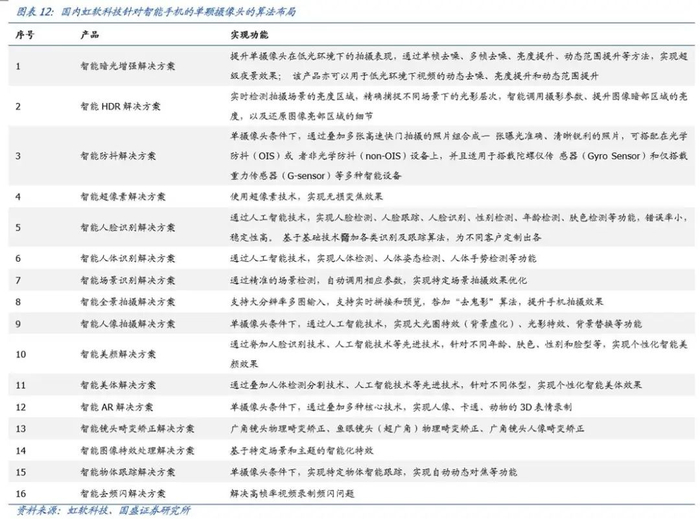 摄像头的性能,与硬件设备和软件算法密切相关,硬件包括主芯片、摄像头传感器、摄像头模组、镜头等,它们决定了摄像头性能的下限;软件算法包括视觉人工智能算法、辅助软件算法等,它决定了摄像头的上限,通过计算视觉算法和辅助软件可以提升硬件的处理能力,突破性能瓶颈,提升成像质量,扩展成像效果。例如苹果手机使用的均为苹果自研的视觉人工智能算法技术,针对苹果硬件设备以及操作系统定制化开发,与硬件设备具有良好的匹配性。