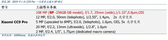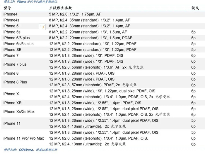 iPhone迭代印证镜头向更高片数结构过渡趋势。自iPhone5s开始,苹果就采用了5P的镜头结构,于第七代iPhone起正式启用6P镜头结构且一直沿用至今,我们可以看到在iPhone 11 Pro系列,已经出现了一个5P镜头搭配2个6P镜头的主摄配置。聚焦国产品牌也有强势表现,如2019年底发布的小米CC 9 Pro旗舰手机,后置四摄中的108MP镜头便直接采用了8P的结构。