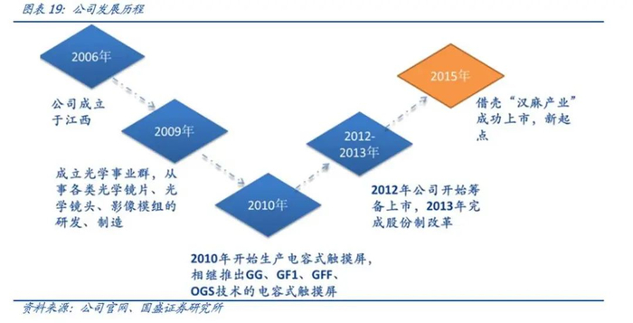 公司成立于 2006 年,总部位于江西省南昌市,从事光学镜头和触摸屏。2009 年 9 月,专门从事各类光学镜片、光学镜头、影像模组。2010 年,电容式触摸屏业务开始起步,陆续推出 GG、GF1、GFF、OGS 技术的电容触摸屏。2012 年,公司开始筹备运作上市。2015 年 12 月,公司借壳“汉麻产业” 在深圳证券交易所上市,进军资本市场。