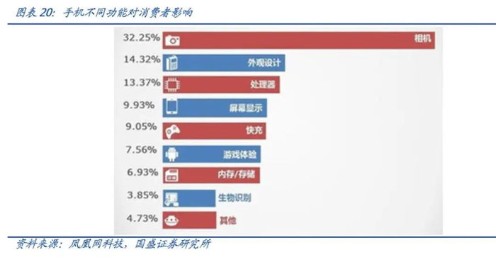 手机厂商不断对镜头进行创新升级,由双摄逐渐向三摄和多摄转变。随着消费者对高质量拍照、录像的需求日益增加,摄像头模组的进化是智能手机发展的必经之路。我们认为摄像头三摄甚至多摄的普及也是未来两年手机创新的重要领域之一。为什么要用三摄镜头?三摄最大的优势在于暗光下拍摄效果佳,并且可以突破3倍以上的光学变焦,可以支持4D预测追焦、四合一混合对焦、5倍混合变焦、10倍数码变焦等功能,背后闪光灯也有多重色温可选,感光器面积增大,可以让噪点控制更优异。