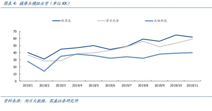 2019年1~11月欧菲光依然保持了的摄像头模组出货量位居冠军的宝座,而舜宇出货量仅次于欧菲光居第二名。在一线20摄像头模组厂中,中国厂商及市场份额均超过半数。根据旭日大数据的统计,2019年11月欧菲光模组的出货量为62KK、舜宇光学的月出货量为59KK、丘钛科技月出货量为40KK,三大模组厂商总体出货超过了中国摄像头模组厂商合计出货的50%以上。