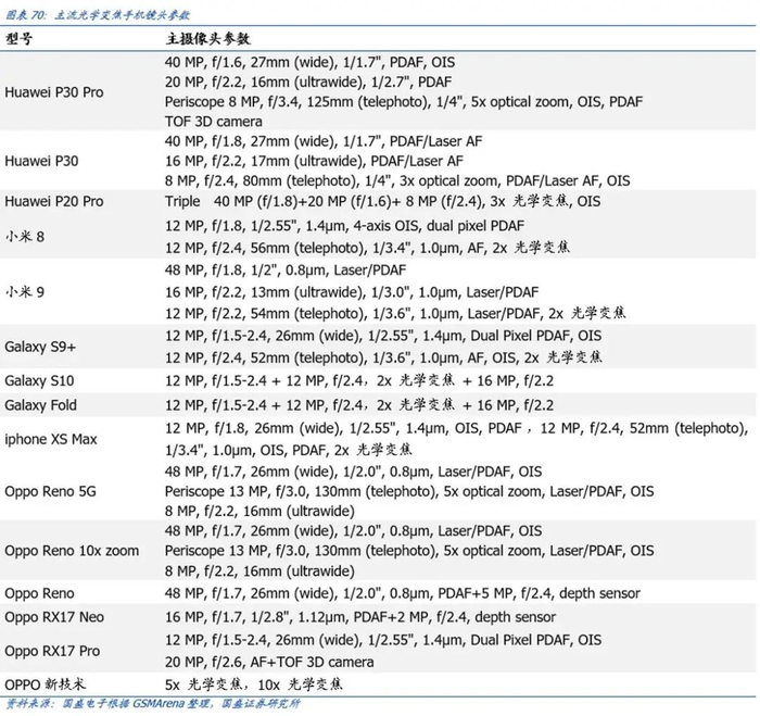 多摄渗透率提速,硬件+软件同时布局,高端多摄壁垒加深,厂商利润率提升。对比2018与2019年国产智能手机摄像头形态可以发现,相比2018年,2019年后置三摄的渗透率从7%左右极速扩张至超过50%,而配置后置四摄手机的市场份额也实现了从0到15%左右的增长。尤其进入2019H2后,双摄及以上数量的后置摄像头配置几乎成为行业标准定义。前置双摄市占率虽变动不大,但随着三星S10+的发布,智能手机前置双摄设置正式登上舞台,随后国内主流品牌陆续跟进,我们认为2020年前置多摄潜力也将释放。摄像头的性能,与硬件设备和软件算法密切相关,高端多摄的技术壁垒加深,使得厂商的利润率提升。