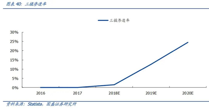 根据Statista的预测,2018年三摄渗透率仅为1.6%,而到了2020年三摄的渗透率将达到24.5%。在采用三摄的机型上,安卓阵营在今明两年或比苹果更加积极。