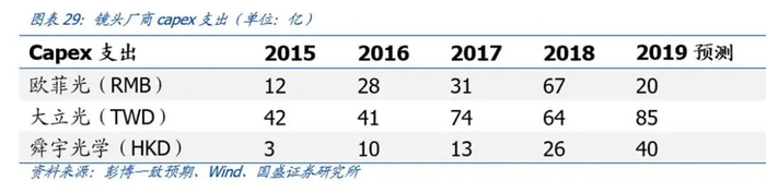随着镜头的不断升级,高端镜头对镜头的产能占用更大,且良率相对较低,所以变相缩小了供给端的产能。目前需求不断攀升而供给产能吃紧,供需缺口不断扩大。通过比较,我们发现龙头镜头厂商大立光、舜宇光学、欧菲光等公司的capex支出的增速有所减小,随着下游需求爆发式的增长,或将影响中期供给。