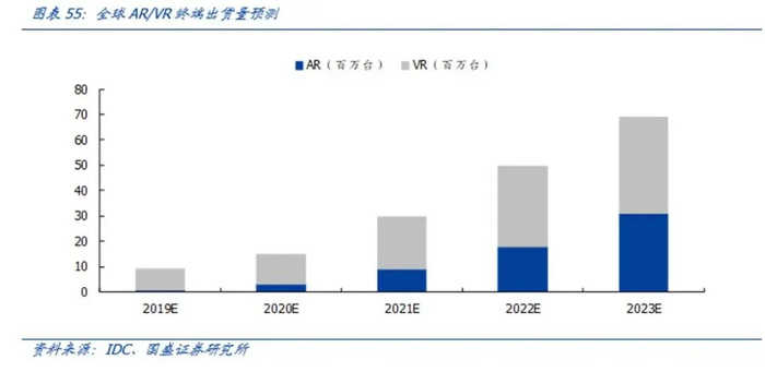 在终端整机方面,根据IDC 3月28日的报告《Worldwide Quarterly Augmented and Virtual Reality Headset Tracker》显示,全球VR/AR头显出货量预计在2019年达到890万,同比增长54.1%。未来出货量预计将以66.7%的复合年增长率在2019-2023年间保持强劲增长,并在2023年达到6860万。