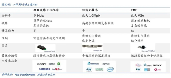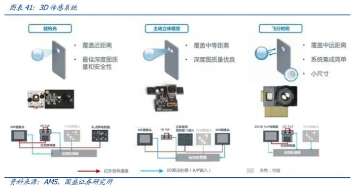 3D sensing是智能手机创新的趋势之一,当前正加速向中低端手机渗透。目前实现3D sensing共有三种技术,分别为双目立体成像、结构光和ToF,目前已经比较成熟的方案是结构光和TOF。其中结构光方案最为成熟,已经大规模应用于工业3D视觉,TOF则凭借自身优势成为在移动端较被看好的方案。