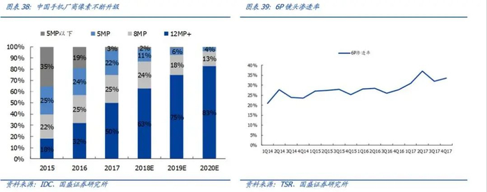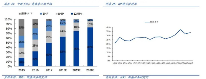 旗舰机种的像素不断升级,由2000万逐渐升至4000万。前置摄像头也逐渐由800万升级至2400万,拍照效果提升。此外,国内高端机种的镜头也逐渐从5P升级到6P,以便实现超级大广角,大光圈,光学变焦也不断升级至三倍,使得夜拍效果逐渐加强。IDC预计2018年后置镜头的6P渗透率约为40%。