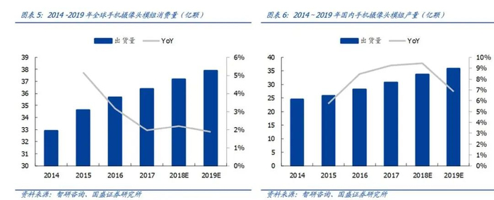 多摄爆发,全球手机摄像头出货量加速成长。根据旭日大数据的预测,在多摄的推动下,2019年全球手机摄像头的出货量约为44亿颗左右,而预估2020年全球摄像头的出货量将达到60亿颗,而2021年全球摄像头的出货量将能继续增长到75亿颗之多。