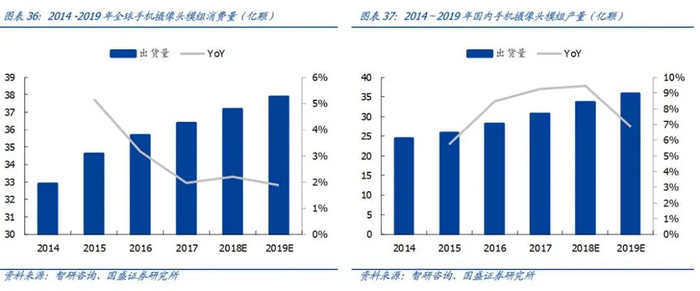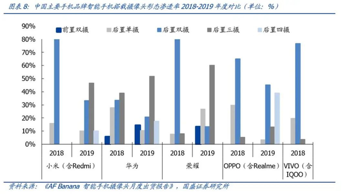 对比2018与2019年国产智能手机摄像头形态可以发现,相比2018年,2019年后置三摄的渗透率从7%左右极速扩张至超过50%,而配置后置四摄手机的市场份额也实现了从0到15%左右的增长。尤其进入2019H2后,双摄及以上数量的后置摄像头配置几乎成为行业标准定义。前置双摄市占率虽变动不大,但随着三星S10+的发布,智能手机前置双摄设置正式登上舞台,随后国内主流品牌陆续跟进,我们认为2020年前置多摄潜力也将释放。