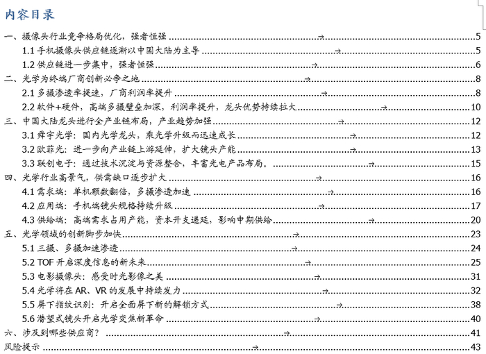 3、资源性壁垒:如今光学赛道的创新,例如潜望式镜头、TOF、3D sensing等,新技术有所突破后,终端厂商更倾向于第一时间与一线厂商进行合作,形成一个闭环。