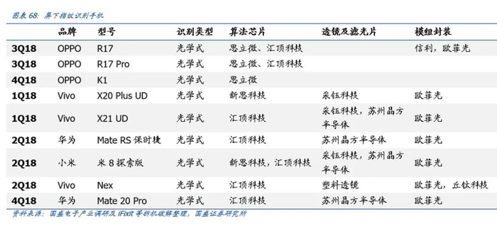 第一部采用屏下指纹手机的是VIVO X20Plus UD,其采用的是新思科技的算法芯片。随后,vivo X21 UD,华为Mate RS保时捷版,小米8探索版、vivo Nex和华为Mate 20 Pro也纷纷配置了屏下指纹解锁的功能,采用的主要是汇顶科技的算法。OPPO与18年下半年的新机也都配备了屏下指纹解锁的功能,主供为思立微。神盾凭借着与三星之间的供应关系,已经通过了认证,成为目前三星光学指纹辨识主要供应商。