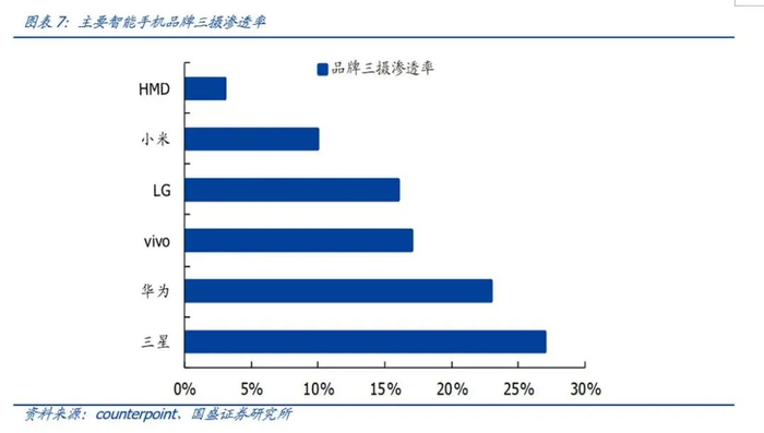 国产主流品牌多摄渗透加速。从三摄手机总出货量情况看,三摄主要集中在三星、华为、OPPO、vivo、小米、苹果、等品牌身上,根据counterpoint数据显示,目前三星三摄及以上手机渗透率最高,达到27%;华为则以23%位居第二。而从整体数据来看,市场中三摄手机目前渗透率为15%,在2020年末将达到35%、2021年突破50%。