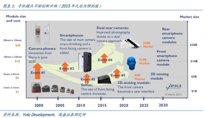 手机摄像头经历了五轮升级,光学领域不断创新。2000年6月夏普首先开始在手机上装载摄像头,开启了移动端的光学市场;iPhone 4首发手机前置摄像头并且摄像头的体积得到了缩减;之后前置摄像头的规格也在不断升级;2017年双摄爆发式增长,如今3D建模等功能正在加速导入,未来手机摄像头将会继续导入AR等功能,光学在自动驾驶、虚拟现实、工业等领域也将取得新的突破。