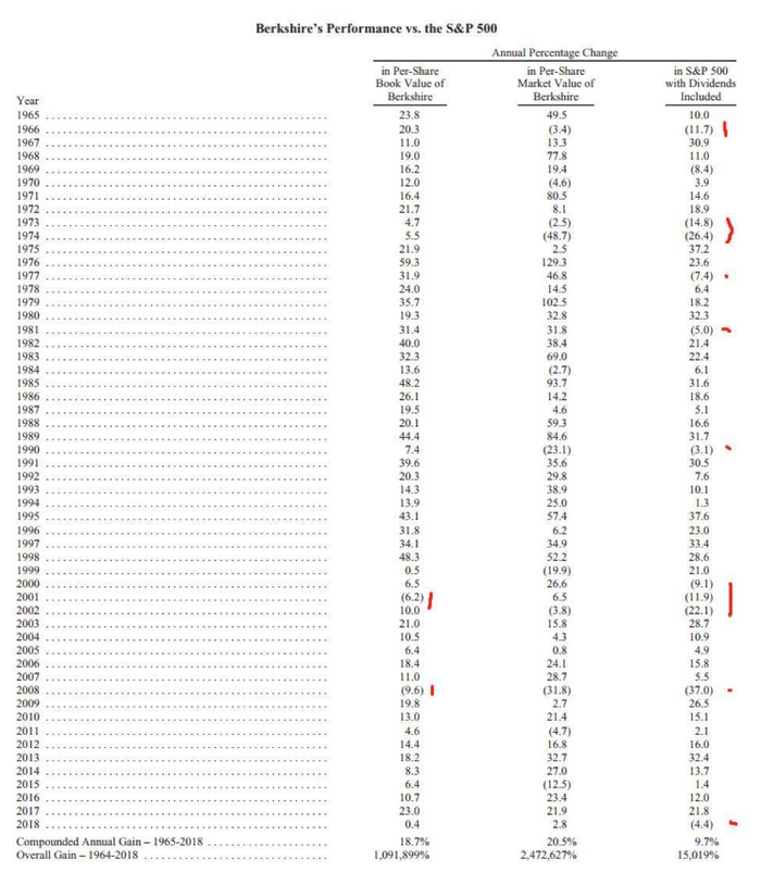 其中标普 500 过去 55 年里有 12 年亏损,而巴菲特只有 2001 年与2008 年两次,分别只是 -6.2% 与-9.6%。