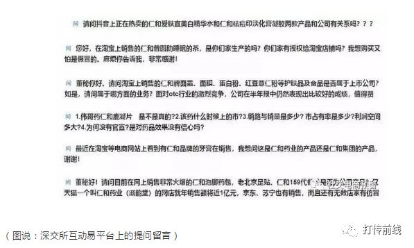 由于贴牌产品种类庞杂、销售渠道混乱,不少投资者在深交所互动易平台对贴牌产品资质提出疑问。例如,一款名为“魔娅仁和泉色调理贴”的产品就借由社交电商广为传播。根据产品包装及介绍,调理贴其实就是女性用卫生护垫,由仁和药业旗下子公司江西康美医药保健品有限公司生产,微商机构广州魔娅国际贸易有限公司负责销售,12片一盒,单盒零售价198元。在电商平台和社交平台,代理对产品的相关描述中,这款产品能“调理”多囊卵巢综合征、子宫肌瘤、盆腔积液等妇科问题。