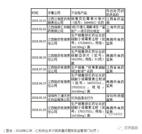 在人员配置上,仁和同样以销售为中心展开。根据仁和药业2018年年报,公司员工总人数7362人,其中销售人员有4523人,占比超过62%。比起研发不力、连年吃老本,仁和更严重且无法推脱的问题,是在质量把控上多次出现漏洞,屡登“黑榜”。近日,江西省药监局发布的行政处罚决定书显示,仁和旗下江西江制医药因销售劣药“克拉霉素分散片”(批号1804062)被没收违法所得约18.8万元。旗下产品出现质量问题,这不是首次。根据记者不完全统计,自2018年以来,仁和药业旗下重要子公司至少8次因药品质量不合格,受到监管部门处罚。