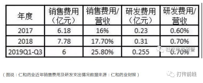 记者整理仁和财报数据发现,今年前三季度,仁和药业研发费用约2550万元,占营收比重约0.7%;2017年、2018年,仁和药业花在研发上的钱也微乎其微,占营收比重都不超过1%。仁和药业宣称,公司十分重视工艺技术和新产品研发,但创新药研发却几乎没有涉足。今年上半年财报显示,产品研发及注册方面,公司仅有3个仿制药一致性评价品种,分别为苯磺酸氨氯地平片、格列齐特缓释片及叶酸片,以及3个化药4类品种,多处于临床前药学研究阶段。其余均为中药品种,均处于物质基准研究阶段。研发吝啬,但在营销方面,仁和出手阔绰,销售费用在过去四年间翻倍。2018年的销售费用高达7.78亿元,约是同期研发费用的26倍。今年前三季度销售费用也已高达6亿元。