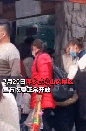 2月23日,江西萍乡,大量游客聚集武功山景区,景区紧急发布通告:根据景区防疫防控要求,为确保游客的舒适度和健康安全,从即时起停售当日景区门票、索道票;2月24日起,景区限流人数从5000人下调至3000人,关闭线下售票窗口。