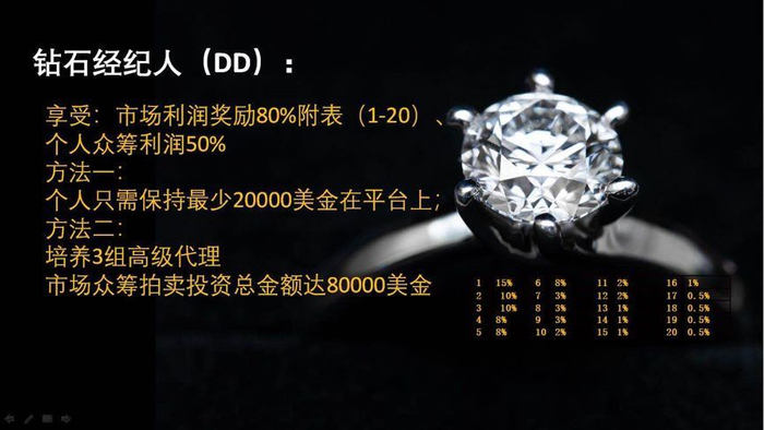 星钻科技有一套人员层级制度,层级有普通会员、代理、钻石经纪人等,这种层级制度基于拉人头和多级抽层。比如,钻石经纪人下面有20层人员,代理下面有10层人员;钻石经纪人可以享受提成奖励,可从手下第一层人员那里抽取15%的提成,从第二层抽取10%等(如下图右下角比例)。不过,要成为钻石经纪人的条件,是要么在平台上保持最少2万美金的资金,要么培养3组高级代理,市场众筹拍卖投资总金额达到8万美金。