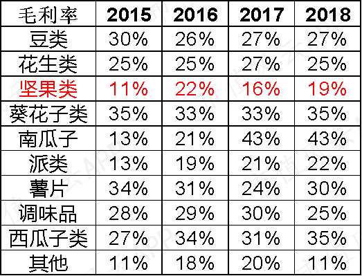 与洽洽食品的其他产品相比,坚果类的毛利率也基本是最低的。葵花子虽然单价低,但毛利率好歹有35%。