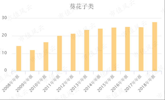 2018年,洽洽食品对葵花子类产品也进行了原料、包装、生产工艺升级,葵花子品类覆盖了低中高端三个价格带,高端系列有葵珍、皇葵,中端产品是蓝袋瓜子,经典款有红袋、绿袋。