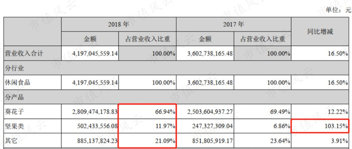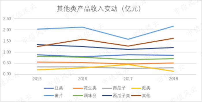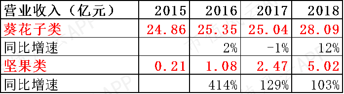 2015-2018年,公司坚果类产品从0.21亿增长到5.02亿,年化复合增长率高达188%。