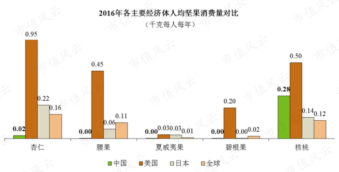 对于杏仁、腰果、夏威夷果、碧根果、核桃五类坚果,我国人均年消费量仅0.23千克,为同期美国的八分之一、日本的二分之一、全球平均水平的二分之一。其中,腰果、夏威夷果、碧根果,我国的人均消费量近乎为零。