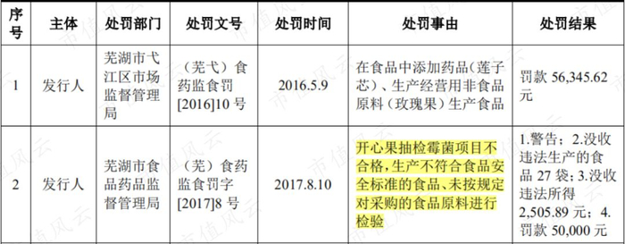 采用代工模式的三只松鼠曾因产品开心果抽检霉菌项目不合格、生产不符合食品安全标准的食品、未按规定对采购的食品原料进行检验而受到行政处罚。