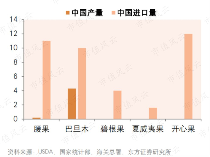 坚果方面,目前,我国高端坚果原料依赖海外进口,自产量严重不足,特别是碧根果、夏威夷果和开心果。