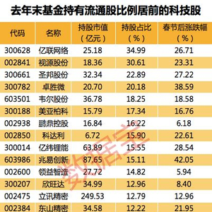 分析认为,科技类ETF和科技类新基金的火爆代表着增量资金对科技股前景的看好,科技股行情有望持续。据此,统计出去年四季度末基金抱团持有的科技股,以飨读者。