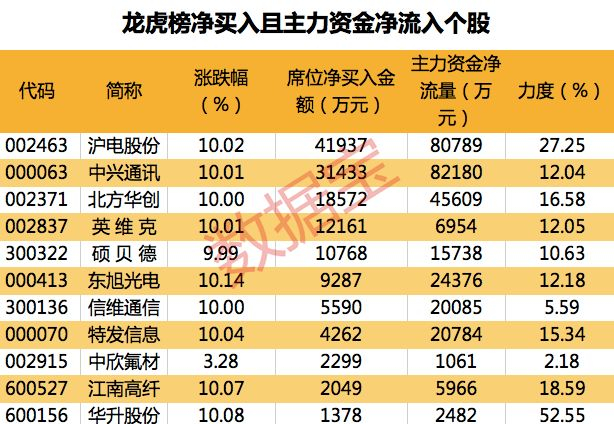 从盘口资金流向来看,主力资金净流入超千万且龙虎榜净买入个股共有12只,其中中兴通讯、沪电股份、北方华创等个股资金净流入金额最大。净流入力度最大的个股有华升股份、沪电股份、江南高纤,净流入力度分别为52.55%、27.25%、18.59%。