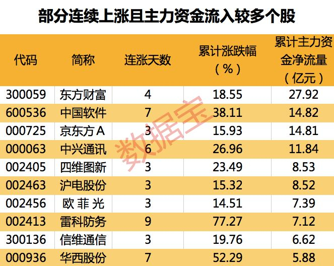 值得注意的是,1156只连续上涨个股中,99只个股期间主力资金累计净流入超过亿元。其中,累计资金流入最多的为东方财富,主力资金累计流入27.92亿元。