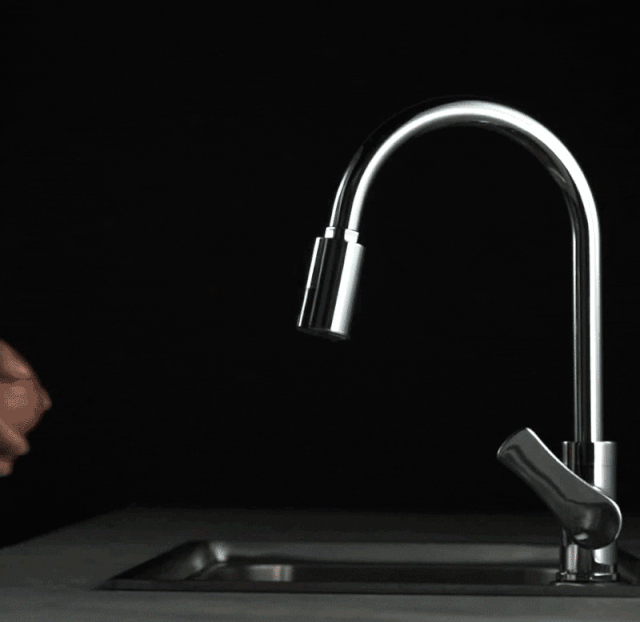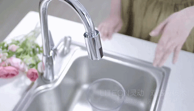 此外,普通水龙头还有很多不便之处:洗碗时水龙头把手处总是会沾附洗洁精泡沫和油污;双手持锅铲时,更是腾不出手去开水龙头……