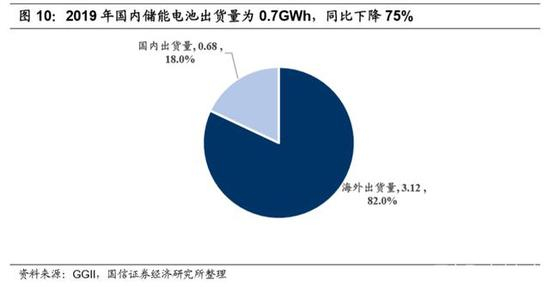 国内储能电池占比较小,海外市场稳定。国内储能电池出货大幅下降,海外市 场稳定。根据高工产研锂电研究所(GGII)数据统计,2019 年中国储能锂电池 出货量为 3.8GWh,同比增长 26.7%。从整体出货量来看,符合年初预期的 2030%的增长,但从出货的市场类别来看,储能锂电池应用于国内市场的出货量 急剧下降,2019 年国内出货量为 0.7GWh,同比下降 75%,而出口海外市场的 出货量增长较为突出。
