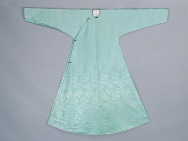 湖色寿山福海暗花绫袷衬衣,清嘉庆,身长146厘米,两袖通长167厘米,袖口宽17厘米,下摆宽124厘米。清宫旧藏。