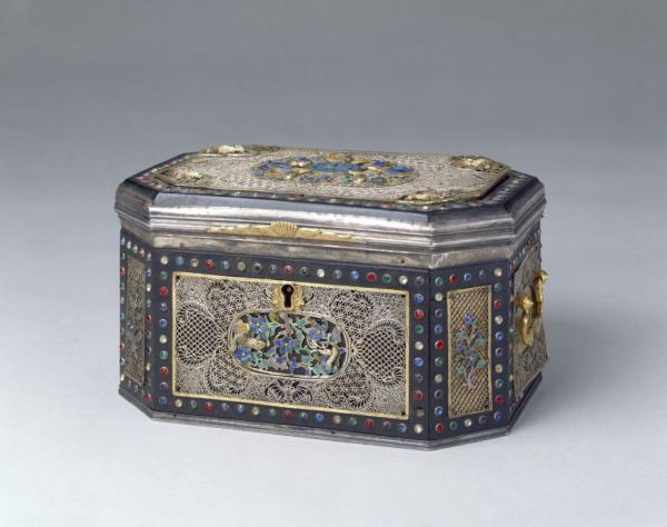 此盒作工精细,富丽堂皇,当为后妃盛首饰之用。盒为银胎,四方委角形,左右两侧设铜镀金提环。各面均以料石围边,内嵌开光,开光内饰银累丝花叶纹及烧蓝花卉、动物等纹饰。特别是盖面的制作更为精致:四角各錾刻松鼠,活泼可爱,中间嵌烧蓝五蝠捧寿纹。此盒的银累丝制作精良,技艺高超,细微处亦精益求精,可谓累丝工艺中的精品。