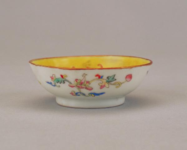 黄地粉彩红蝠纹盘,清同治,高2.8厘米,口径7.7厘米,足径4.2厘米。