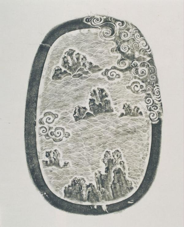 砚以端石制,石质细腻,色黝紫,坚润如旧坑端石。椭圆形砚式,砚堂宽阔,砚池处雕饰蝙蝠云纹,5只展翅的蝙蝠错落有致,寓五福之吉意。砚边周饰云纹。砚背面雕刻海水仙山图,意寓寿山福海之祥瑞。