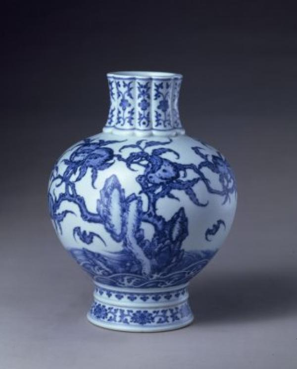 瓶花口,瓜棱式颈,溜肩,圆腹,圈足微外撇。颈部绘折枝花卉,腹部绘一株桃树,树枝上结有数枚寿桃,树下绘山石与江崖海水纹,空间绘飞蝠,近底处绘变形如意头和折枝莲纹各一周。足内青花篆书“大清乾隆年制”六字款。
