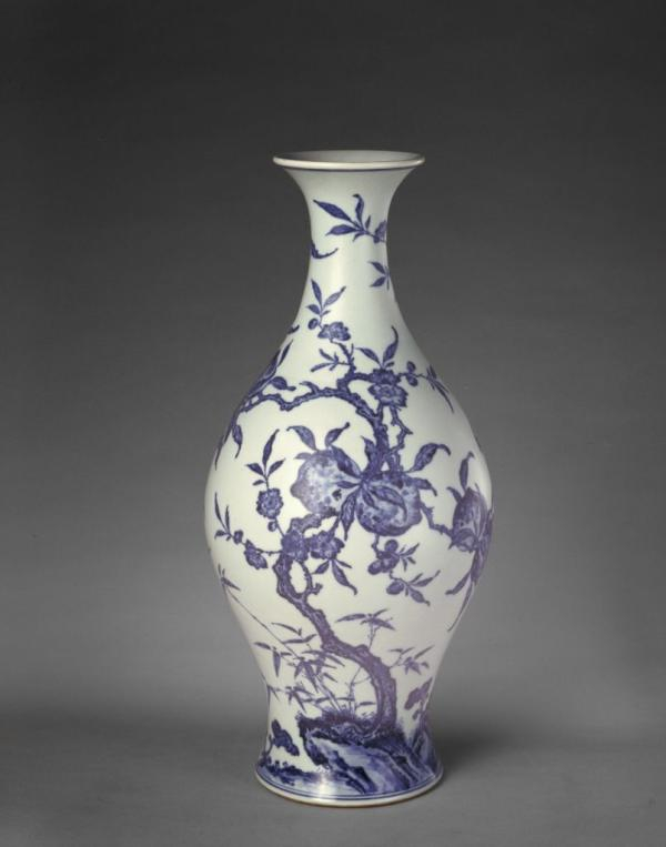 雍正朝官窑瓷器以造型端庄、做工精细著称。此瓶造型秀丽,构图疏密得当,工艺精巧。青花画风仿明永乐、宣德风格,以点染的重笔模仿铁结晶斑点,于清秀中显露出古朴刚劲之风。图案中的桃实、桃花、桃枝、蝙蝠、灵芝、竹子等,在传统文化中均属于吉祥图案,寓意福寿吉祥。此瓶为雍正官窑青花瓷器的杰出之作。