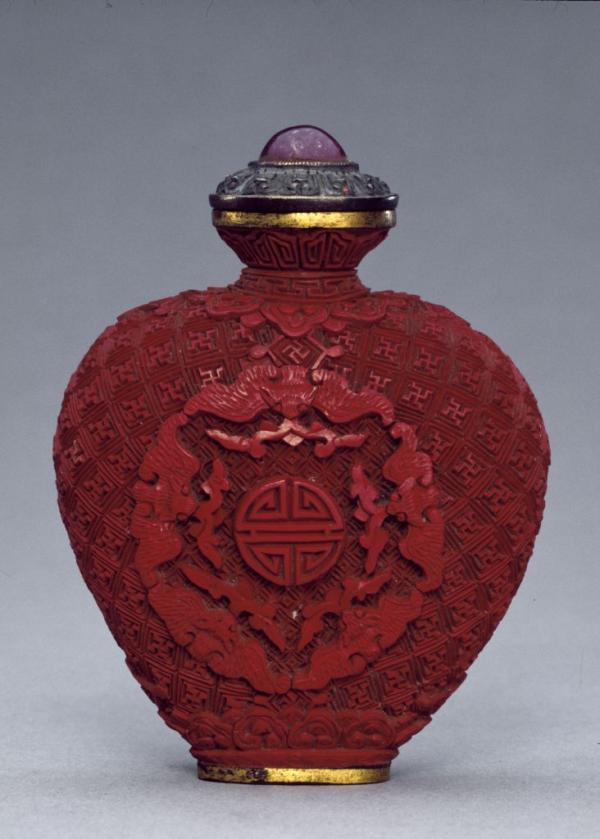 这件雕漆鼻烟壶应是在乾隆年间由清宫造办处画样后交苏州织造成做的。鼻烟壶侈口,丰肩,扁腹微鼓,平底,圈足极矮。内为铜胎,颈、腹部雕红漆“卍”字锦地五蝠捧寿纹,无款。附银莲瓣纹嵌碧玺盖,盖下连象牙匙。口、足鎏金。刀法快利,纹饰精细纤巧,具有乾隆朝雕漆的显著特点。围绕图案化寿字的5只蝙蝠一律采用俯视构图,尽管设计略显呆板,但类似的纹样在其它材质的官造器物上比较常见,可以视作一种典型的宫廷风格。