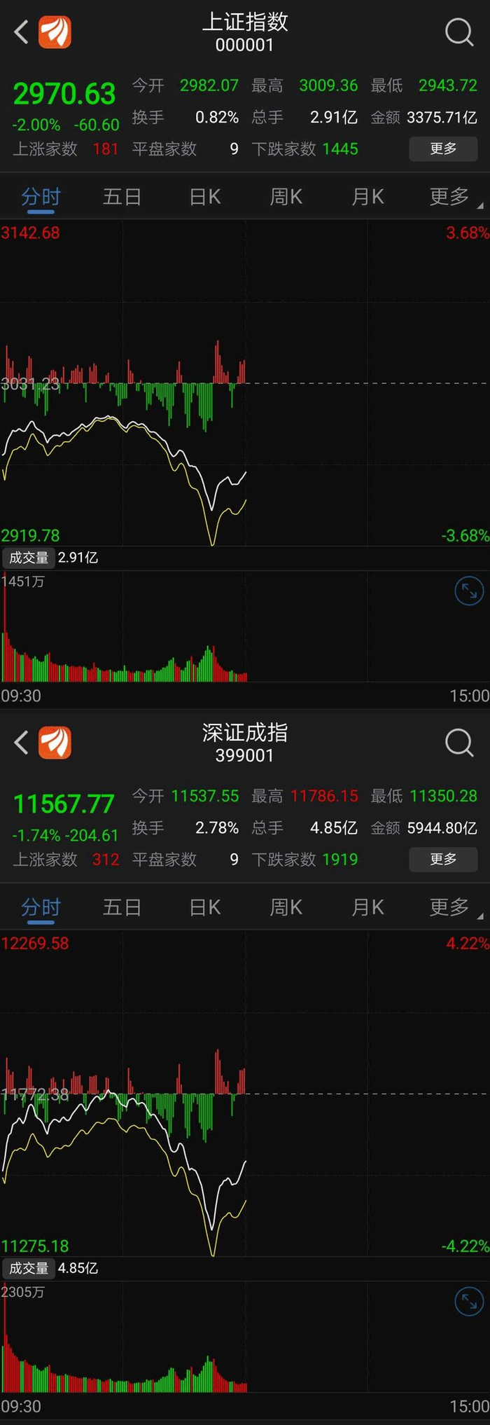 A股今日早盘也被大幅拖累。截至午间,沪指大跌2%,深证成指下跌1.74%,创业板指下跌1.96%。同时,在下跌当中,早盘两市成交高达9321亿元。行业板块方面,仅医疗行业一枝独秀,逆势飘红。种业、数字货币、金融机具、仪表仪器等板块跌幅居前。
