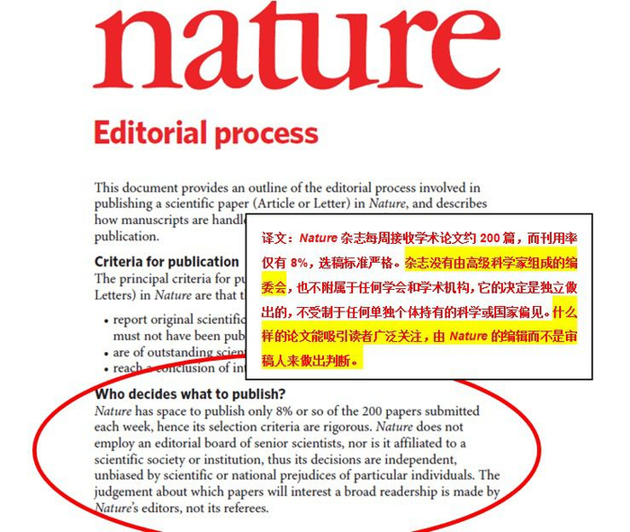 审稿规定写得非常清楚,杂志没有由高级科学家组成的编委会,也不附属于任何学会和学术机构,它的决定是独立做出的,不受制于任何单独个体持有的科学或国家评定。什么样的论文能吸引读者广泛关注,由Nature的编辑,而不是审稿人做出判断。