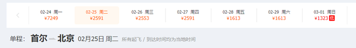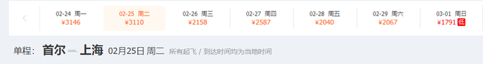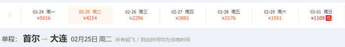 据报道,以首尔飞青岛为例,往常价格不到500元,然而2月24日机票价格涨至4000元以上都已售罄,2月25日机票最近价格已涨至3000元以上,且只剩一趟航班,目前余票只有个位数,可谓一票难求。