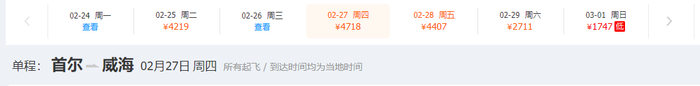 接下来几天,首尔飞青岛单趟航班价格最低也在1600元-2500左右。