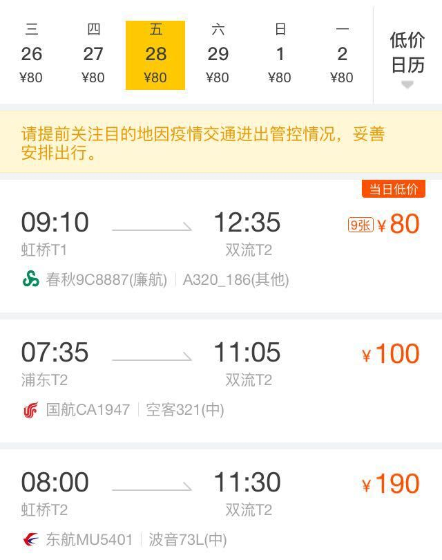 受新冠肺炎疫情影响,出行需求急剧下降,近期很多航空公司都采取了缩减航班,甚至停飞航线的措施来应对。每经小编查询发现,2月26日到这个月底,上海到成都经济舱单程票价仅需百余元,最低只要80元。北京到成都机票最低也仅需200余元。