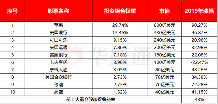 2019年,伯克希尔·哈撒韦投资组合中10个最大的普通股投资一年的加权回报率为43%。这几乎是同期标准普尔500指数上涨23%的两倍。